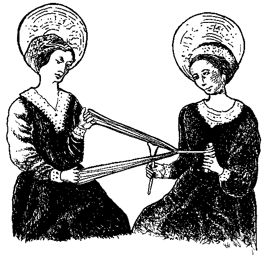 ![]() One braider and helper pictured in 1465 CE, from the Spanish altar piece "Historia de la Virgen Maria," attributed sometimes to Nicolas de Zahortiga.1 |